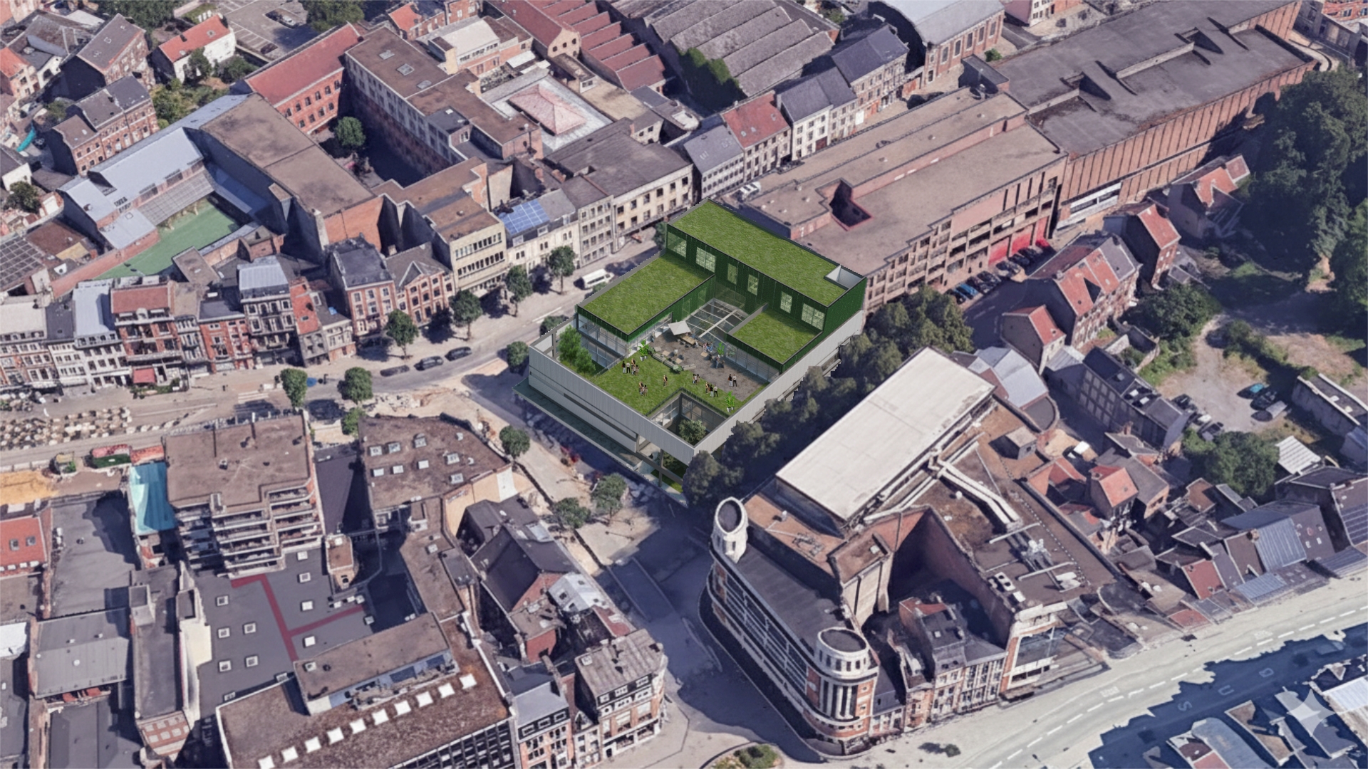 en plein cœur de ville, face à la place du Martyr récemment rénovée, à côté du CPAS et de la future cité administrative, entouré d’écoles et proche du futur quartier multifonctionnel « Belgacom ».
